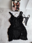 Комплект складається з мереживної сорочки та трусиків стрінг. Бретелі регулюються для ідеальної посадки.
